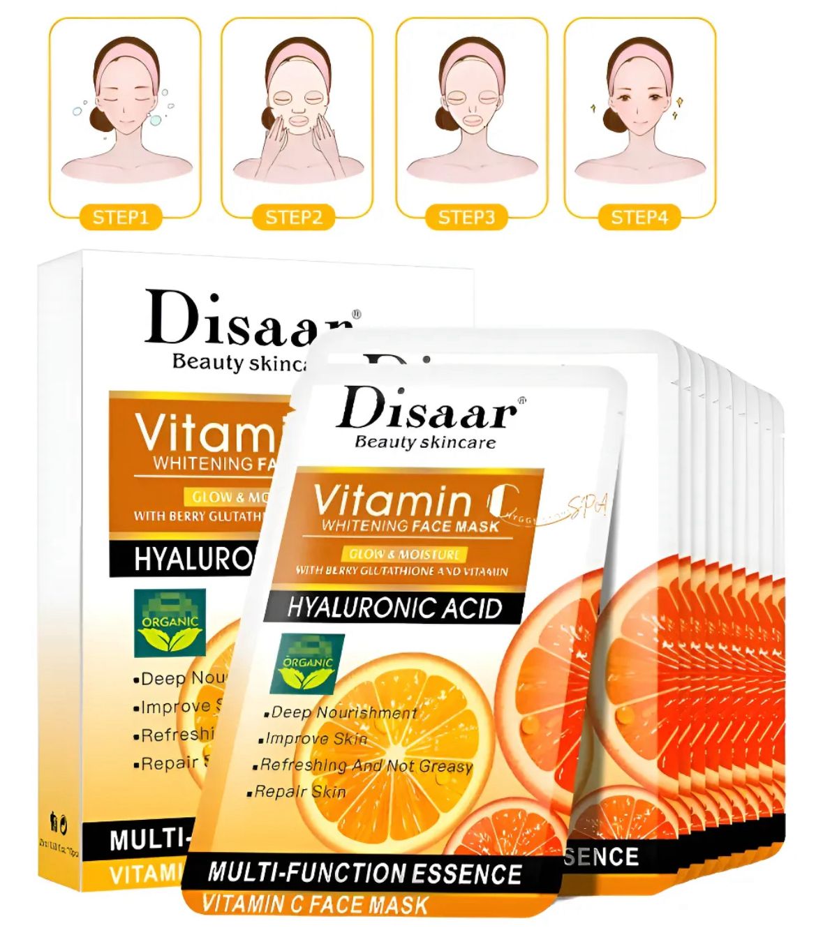 La mascarilla facial Disaar con Vitamina C y ácido hialurónico ayuda a hidratar profundamente la piel, mejorar su luminosidad y aportar una sensación de frescura inmediata. Su fórmula nutritiva contribuye a suavizar la piel, mejorar su apariencia y mantenerla visiblemente más hidratada.
