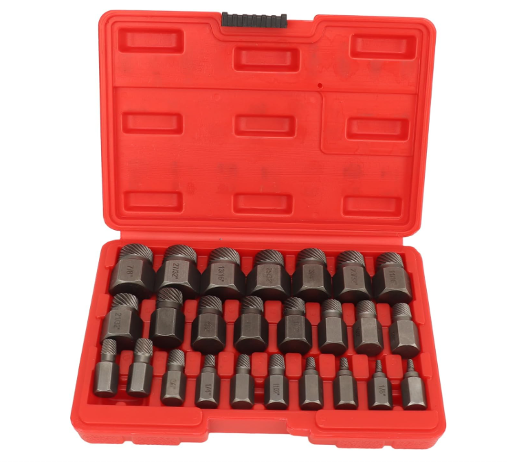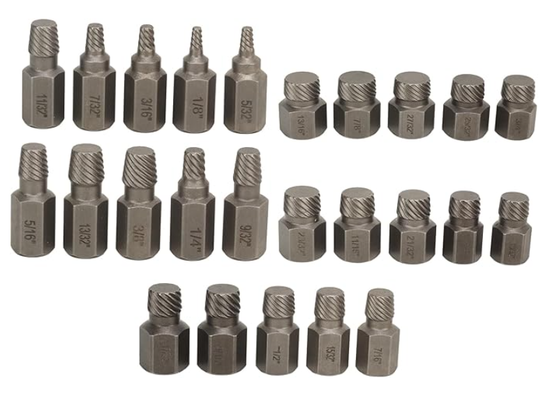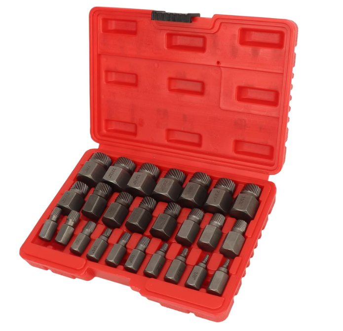 Juego de extractores de tornillos de 25 piezas: este juego de extractores de pernos incluye 25 herramientas diseñadas específicamente para quitar diferentes tipos de tornillos. Se puede utilizar tanto con herramientas manuales como eléctricas, lo que lo hace adecuado para una amplia gama de escenarios de desmontaje.