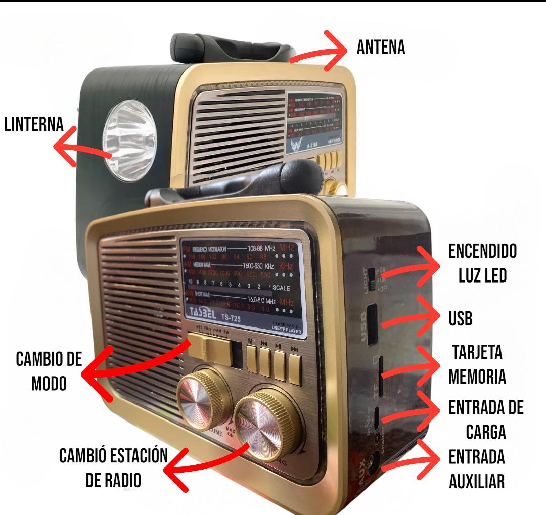 Disfruta de la combinación perfecta entre estilo vintage y funcionalidad moderna con esta radio recargable. Ya sea en tus aventuras o en situaciones de emergencia, tendrás a tu disposición diversas opciones de entretenimiento y una linterna útil en un solo dispositivo.