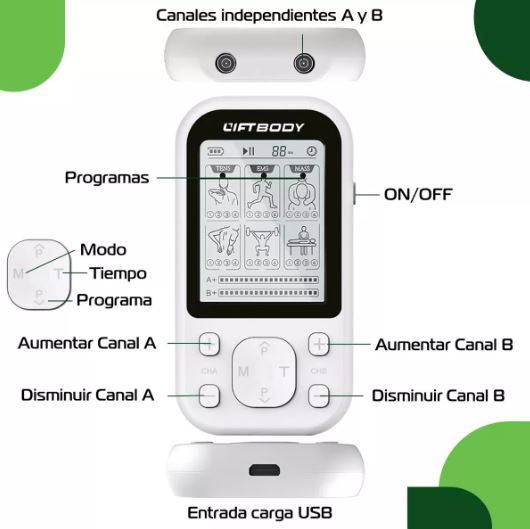 - Canales dobles A/B: puedes operarlo con diferentes ajustes de intensidad para cada canal para terapia de alivio del dolor. Canales completamente independientes que hasta pueden ser utilizados por 2 personas.