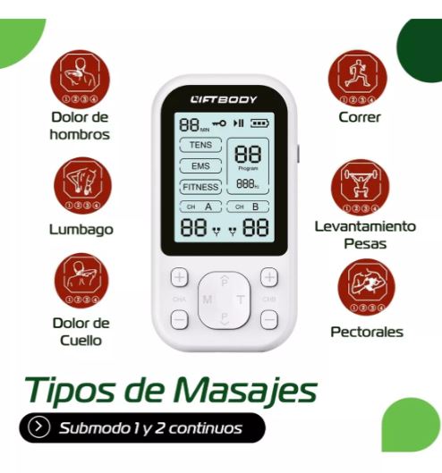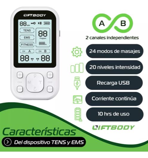 El dispositivo TENS de Liftbody te ayudará a liberar tensiones fácilmente, olvidarte de dolores musculares del pasado y disfrutar de un agradable masaje, perfecto tanto para lesiones deportivas, como dolores musculares por mala postura y más...