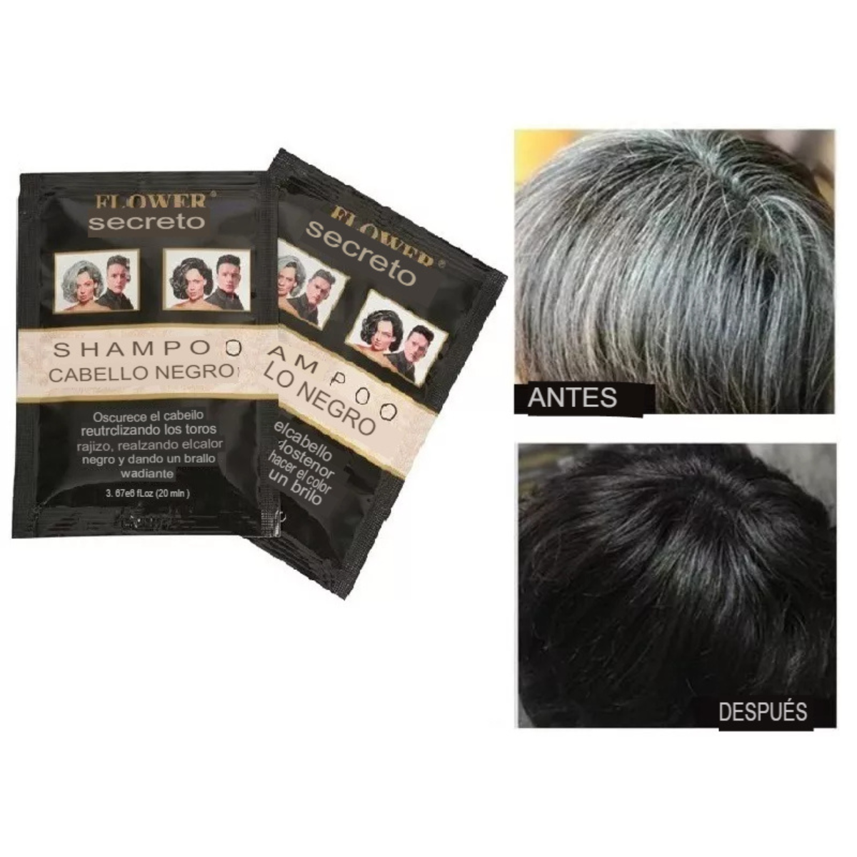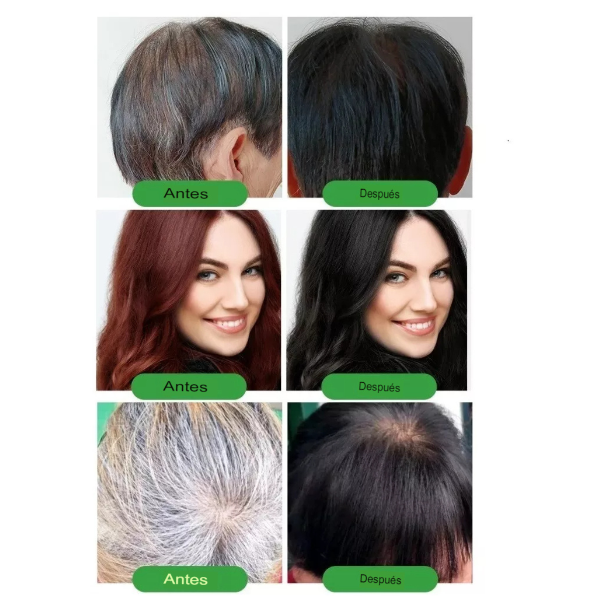 - Cobertura Rápida: En tan solo 5 minutos, nuestro shampoo negro cubre las canas, proporcionando un color negro natural y vibrante.